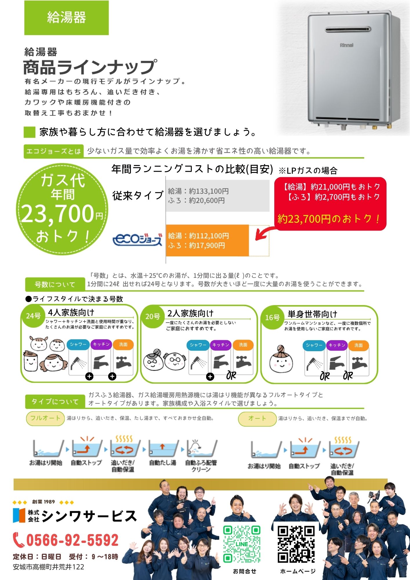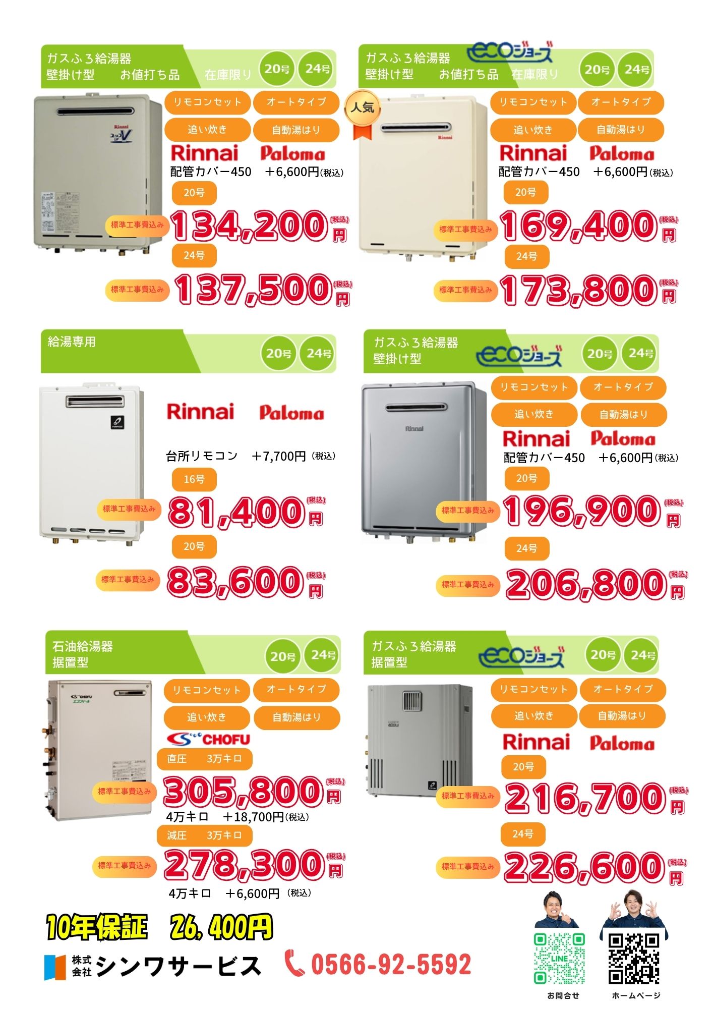 ガス給湯器の交換、取付け工事なら安城市のシンワサービスへおまかせください! お見積りから取替え工事まで自社責任施工。顔の見える工事で安心をお届けします。 今お使いのガス給湯器が故障や買替をご検討の場合はお気軽にお電話もしくはお問い合わせにてご相談ください。 地域密着の良さを活かし、スピード対応&フォロー体制でお待ちしております!掲載商品以外でもご希望の商品がございましたらお申し付けください。