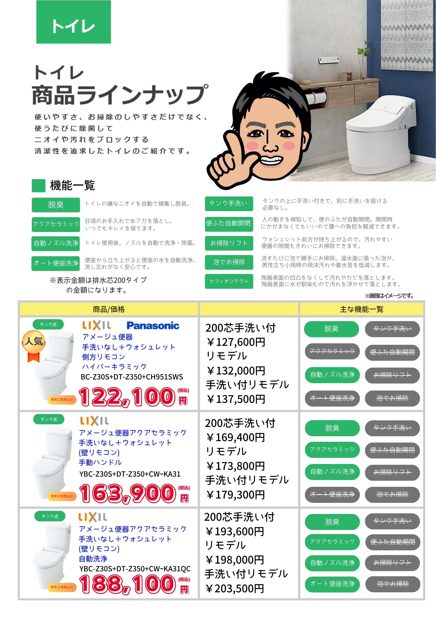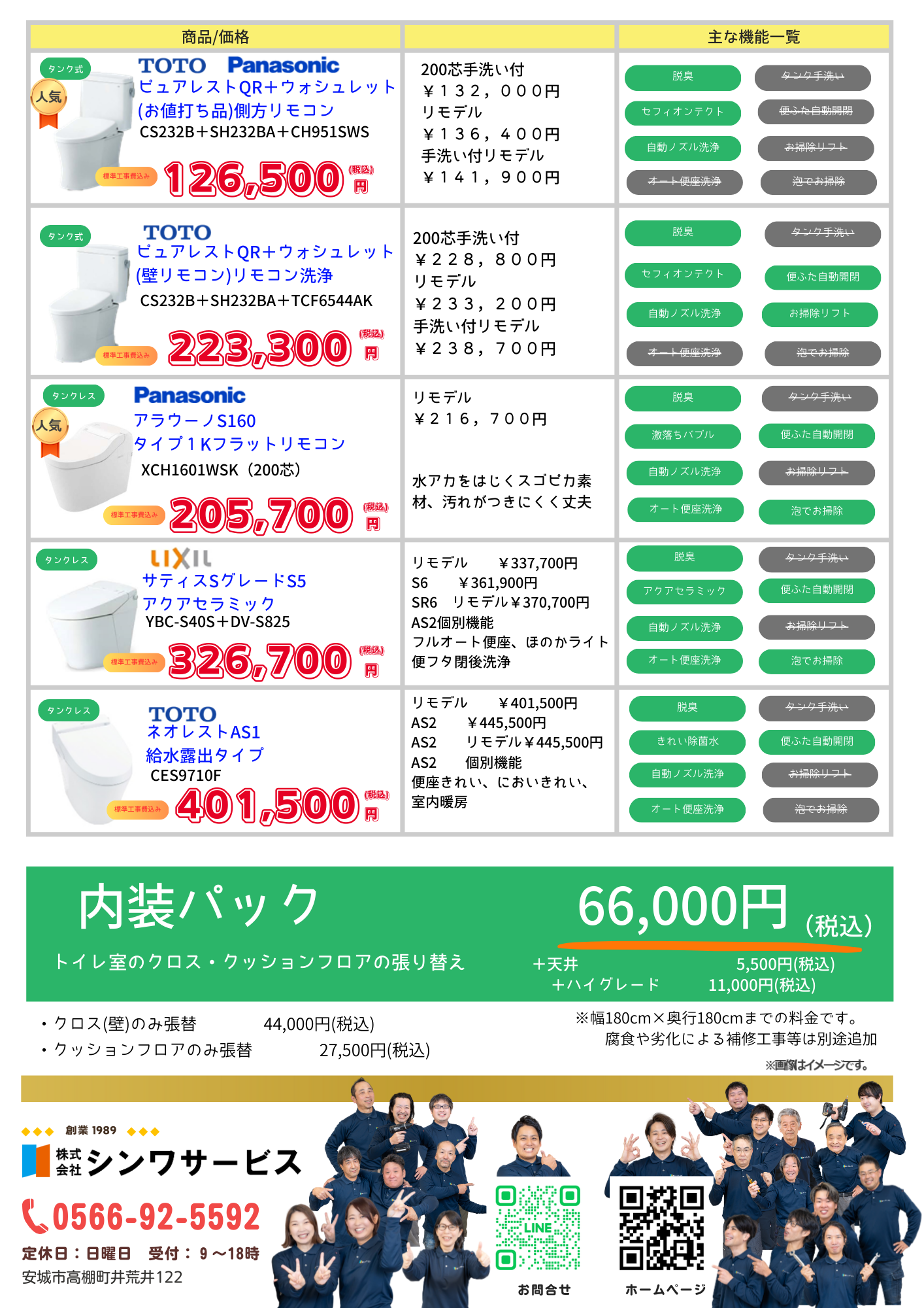 トイレの交換、取付け工事なら安城市のシンワサービスへおまかせください! 大手メーカーの最新機種にてご提案いたします。お見積りから取替え工事まで自社責任施工。顔の見える工事で安心をお届けします。 今お使いのトイレが故障や買替をご検討の場合はお気軽にお電話もしくはお問い合わせにてご相談ください。 地域密着の良さを活かし、スピード対応&フォロー体制でお待ちしております!掲載商品以外でもご希望の商品がございましたらお申し付けください。